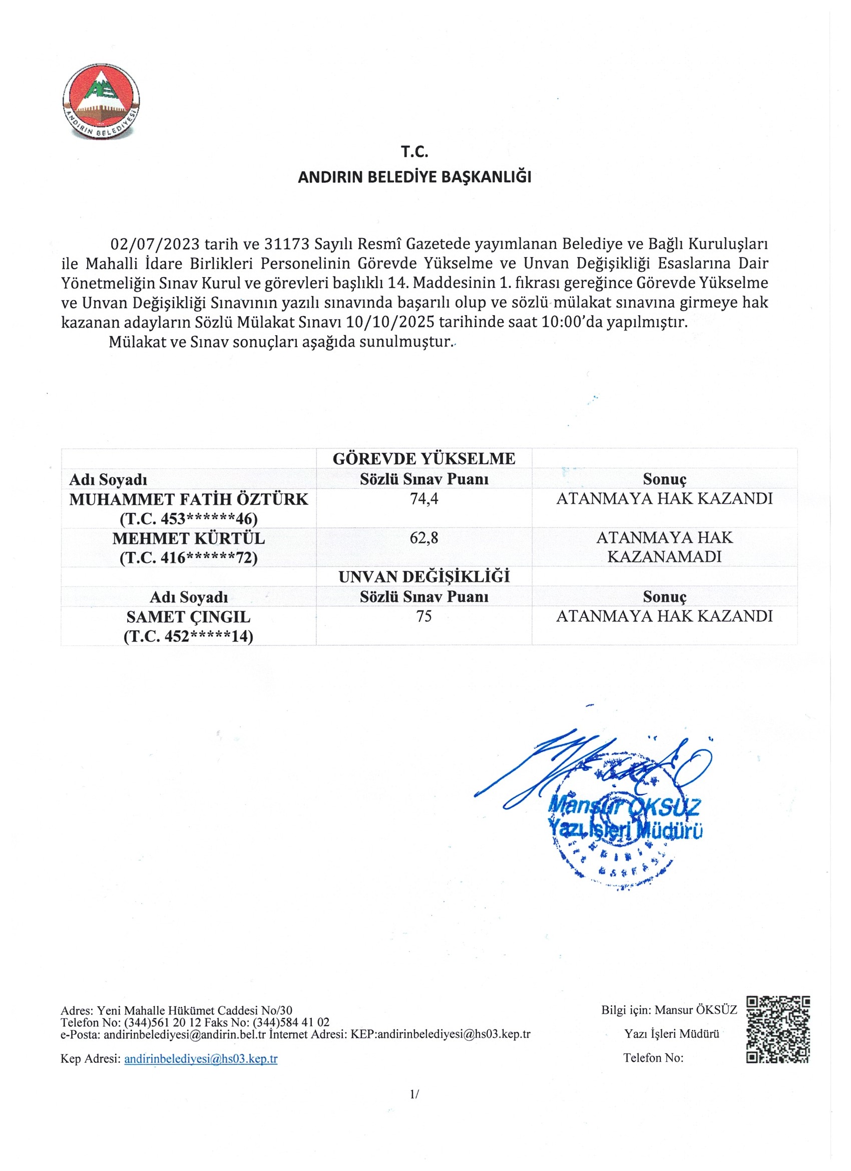 02/07/2023 tarih ve 31173 Sayılı Resmî Gazetede yayımlanan Belediye ve Bağlı Kuruluşları ile Mahalli İdare Birlikleri Personelinin Görevde Yükselme ve Unvan Değişikliği Esaslarına Dair Yönetmeliğin Sınav Kurul ve görevleri başlıklı 14. Maddesinin 1. fıkrası gereğince Görevde Yükselme ve Unvan Değişikliği Sınavının yazılı sınavında başarılı olup ve sözlü mülakat sınavına girmeye hak kazanan adayların Sözlü Mülakat Sınavı 10/10/2025 tarihinde saat 10:00’da yapılmıştır.