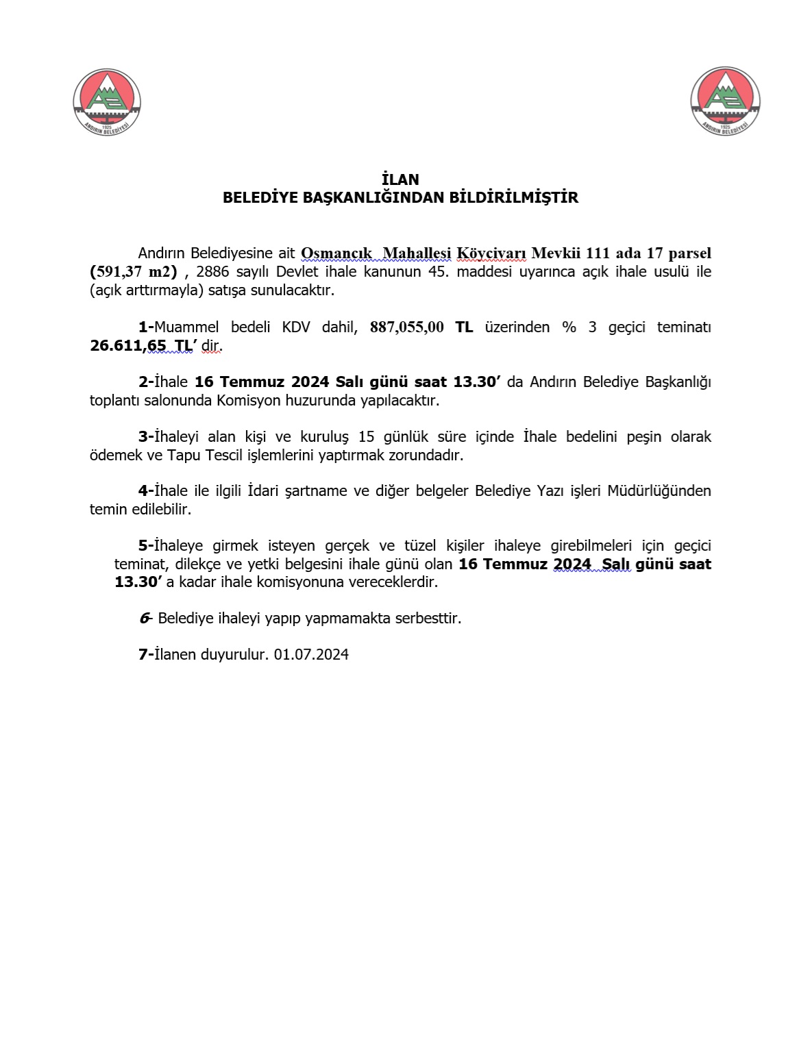Andırın Belediyesine ait Osmancık Mahallesi Köycivarı Mevkii 111 ada 17 parsel (591,37 m2) , 2886 sayılı Devlet ihale kanunun 45. maddesi uyarınca açık ihale usulü ile (açık arttırmayla) satışa sunulacaktır.