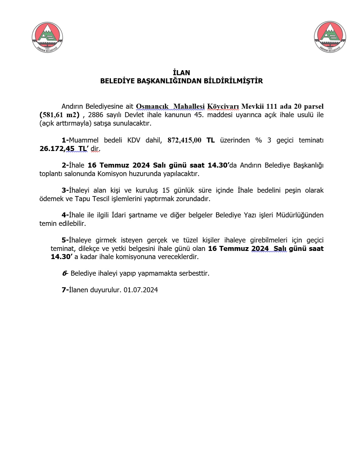 2-İhale 16 Temmuz 2024 Salı günü saat 14.30’da Andırın Belediye Başkanlığı toplantı salonunda Komisyon huzurunda yapılacaktır.