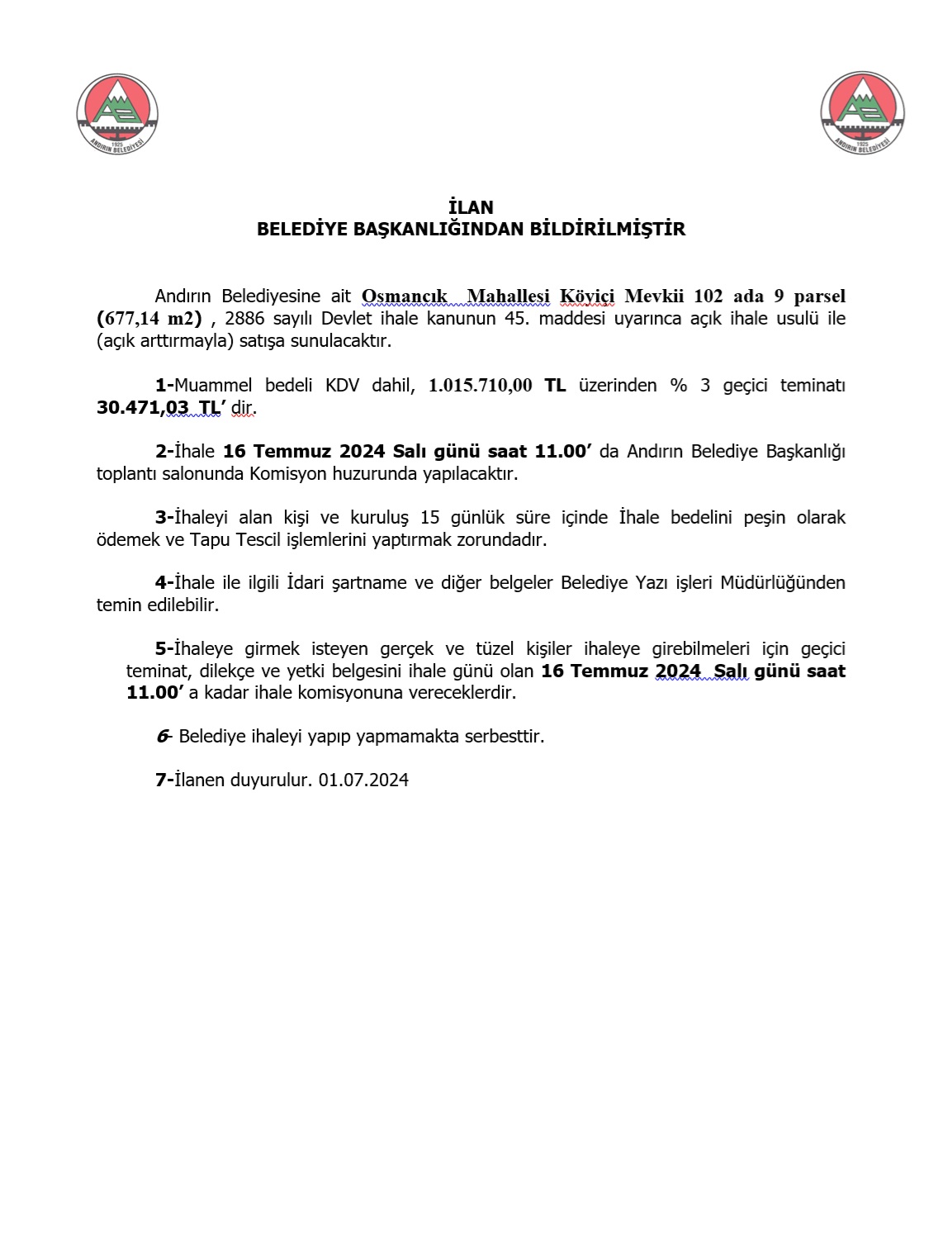 Andırın Belediyesine ait Osmancık Mahallesi Köyiçi Mevkii 102 ada 9 parsel (677,14 m2) , 2886 sayılı Devlet ihale kanunun 45. maddesi uyarınca açık ihale usulü ile (açık arttırmayla) satışa sunulacaktır.